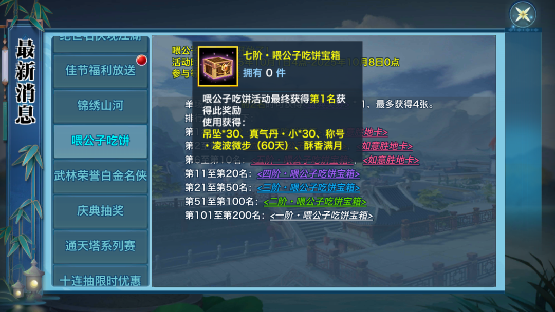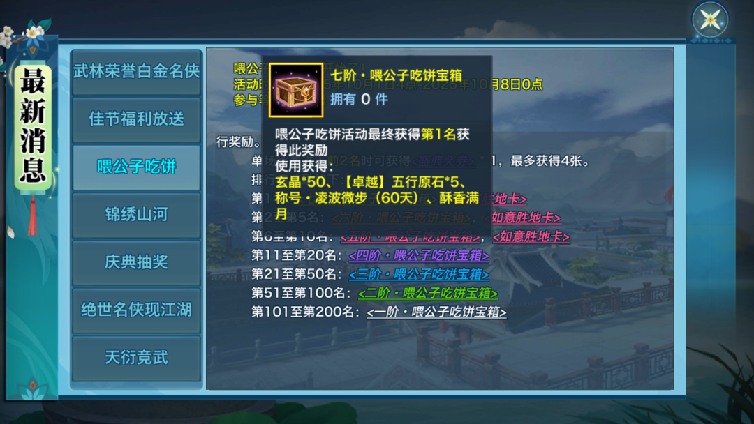 第1名:七阶·喂公子吃饼宝箱、如意胜地卡第2至第5名:六阶·喂公子吃饼宝箱、如意胜地卡第6至第10名:五阶·喂公子吃饼宝箱、如意胜地卡