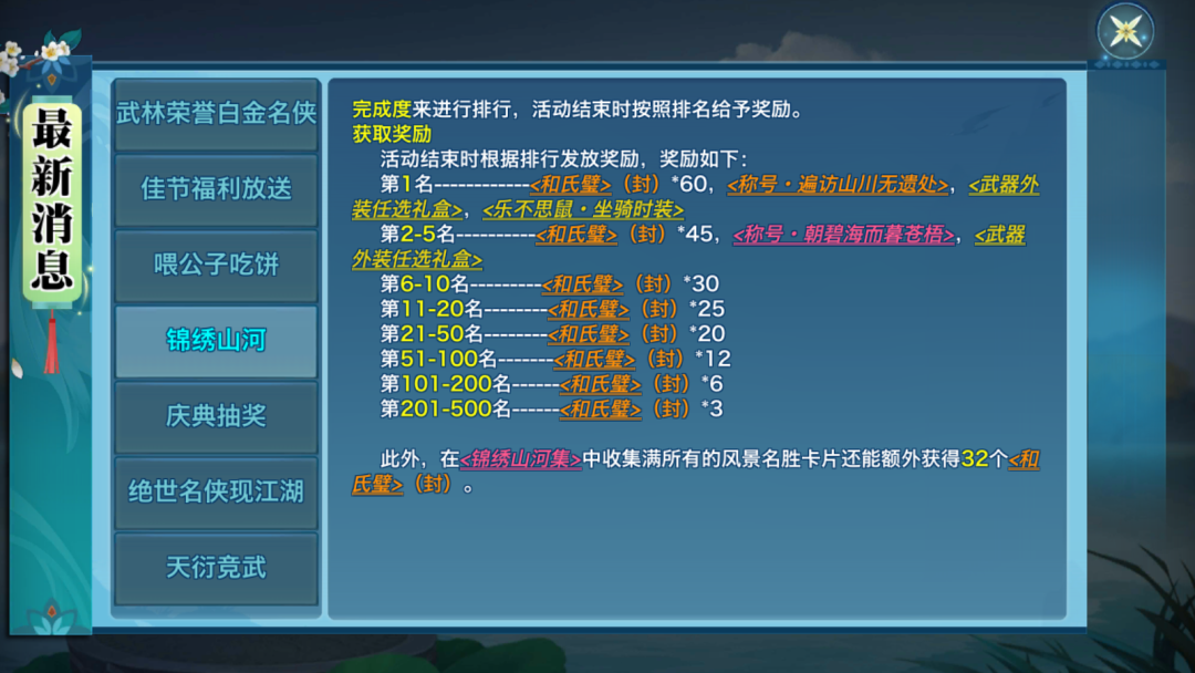 ▲仅为示意,实际以当前区服为准活动结束后将根据【锦绣山河集】的收集完成度排行发放奖励,海量和氏璧,限定活动称号·遍访山川无遗处、称号·朝碧海而暮苍梧、武器外装任选礼盒、坐骑·乐不思鼠等你获取!