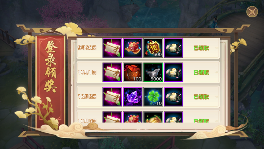 笔墨间书签到字,福泽获宝好运来!9月30日4:00至10月15日4:00期间,40级以上的少侠每天登录即可领取丰厚的游戏道具资源,更可必得活跃度道具【桃花糕】!