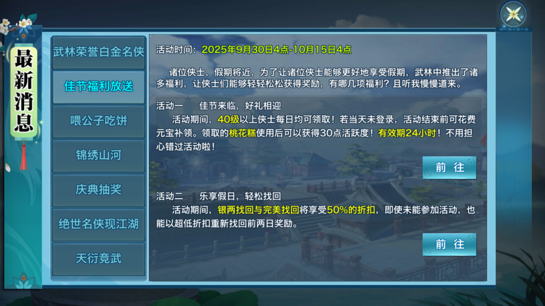 双节同庆,江湖共欢。多重好礼相伴,愿诸位少侠在假期中畅享别样江湖乐趣。