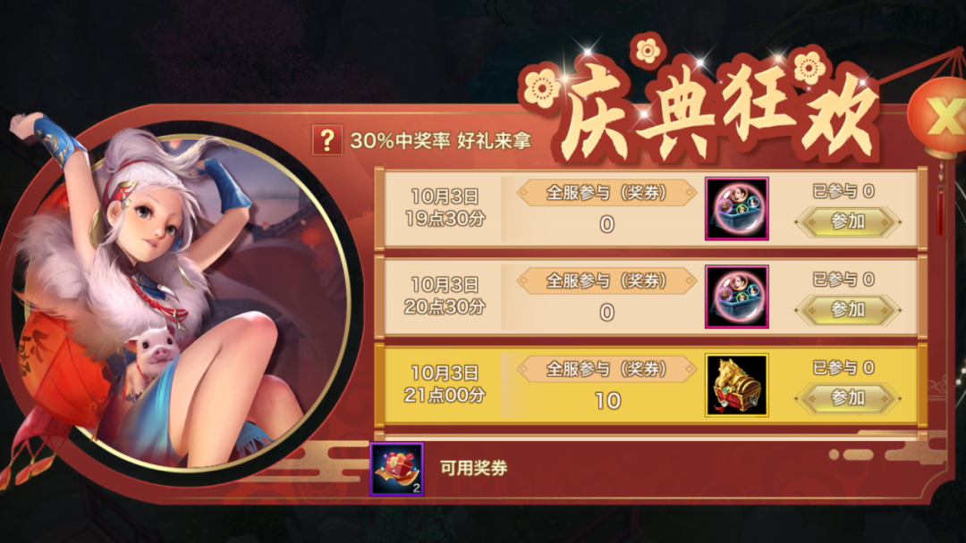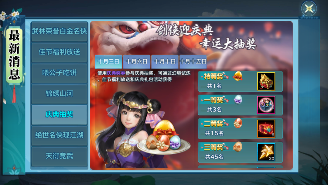 第十届江湖盛典即将启幕,盛典抽奖活动抢先登场!9月27日至10月15日期间,少侠们可通过庆典礼包、盛典签到、喂公子吃饼活动获取【盛典奖券】参与抽奖活动,多轮大奖抽不停!