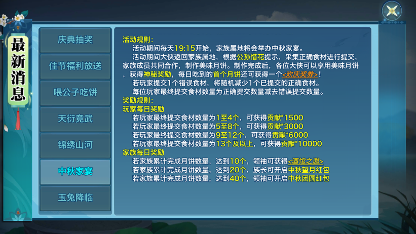 每天举办的中秋家宴活动会根据个人和家族的完成度/制作月饼数发放对应的奖励,少侠们要加油啦!