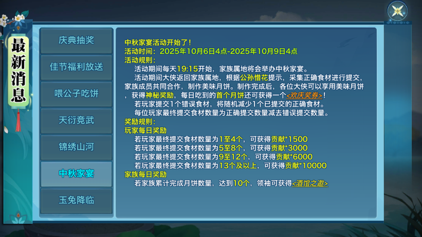 月到中秋分外明,人间最美是团圆。10月6日-10月8日每晚19:15,家族烤火期间的答题活动将暂时替换为【中秋家宴】,诚邀少侠与家族好友共聚一堂,收集食材、制作月饼、同赏明月!