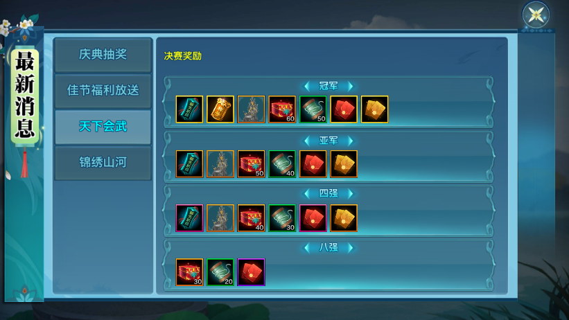 进入决赛更有机会冲击【专属家具·武道王座】、限定称号、和氏璧等奖励!详情请各位少侠移步游戏内查看。小师妹已经迫不及待想看各位少侠在赛场上一展身手了!