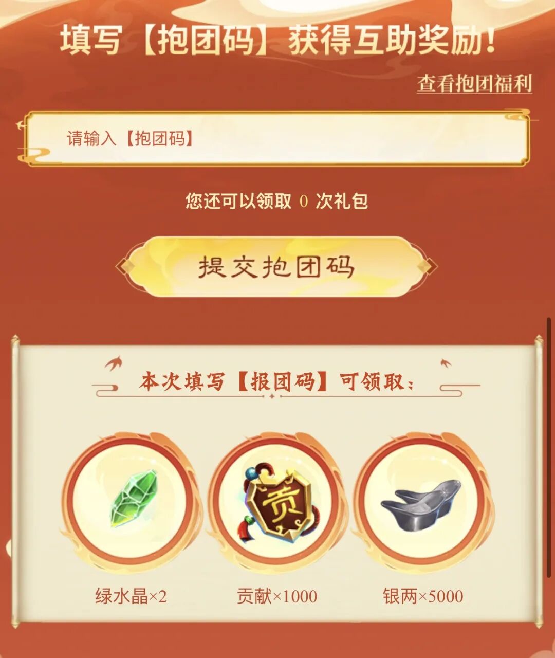 每个抱团队伍的【抱团码】可以被无限制提交,只要少侠分享的人多,就可以持续积累抱团队伍积分。
