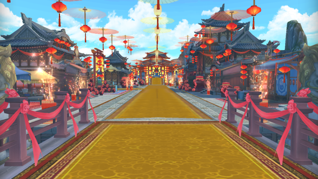 新场景兼具中式古典建筑雅致与市井文化热闹感,颇具繁华喜庆、充满民俗气息的市井游乐氛围。