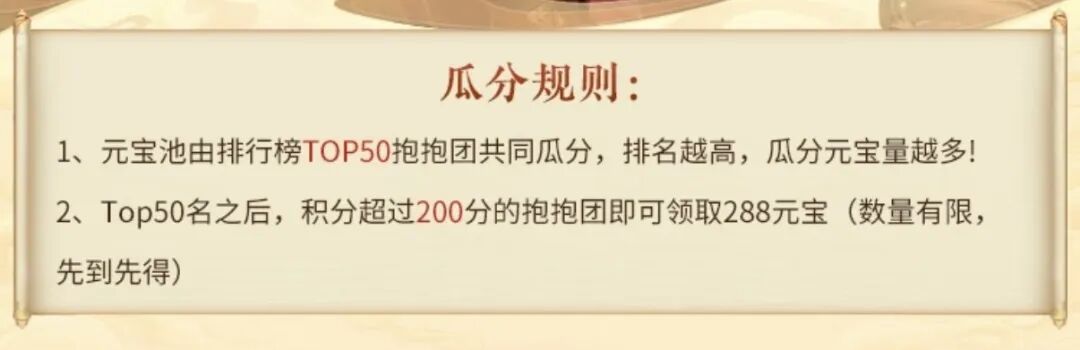活动结束后,积分排名前50名的少侠可以参与瓜分20W元宝!剩余队伍只要超过200积分,即可领取288元宝,数量有限,先到先得!