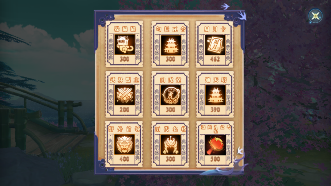 少侠们参与躲猫猫、勾栏瓦舍、白虎堂、野外首领等日常活动可以获得典票经验值,用以解锁典票·盛典各等级奖励!