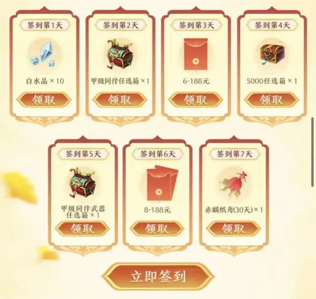 六、回归登录再送甲级同伴、背饰外观领取回归礼包的少侠,前往新服累计登录达到指定天数还可以领取飞升礼包,包含赤麟纸鸢、甲级同伴武器等奖励,单账号各限领1次。