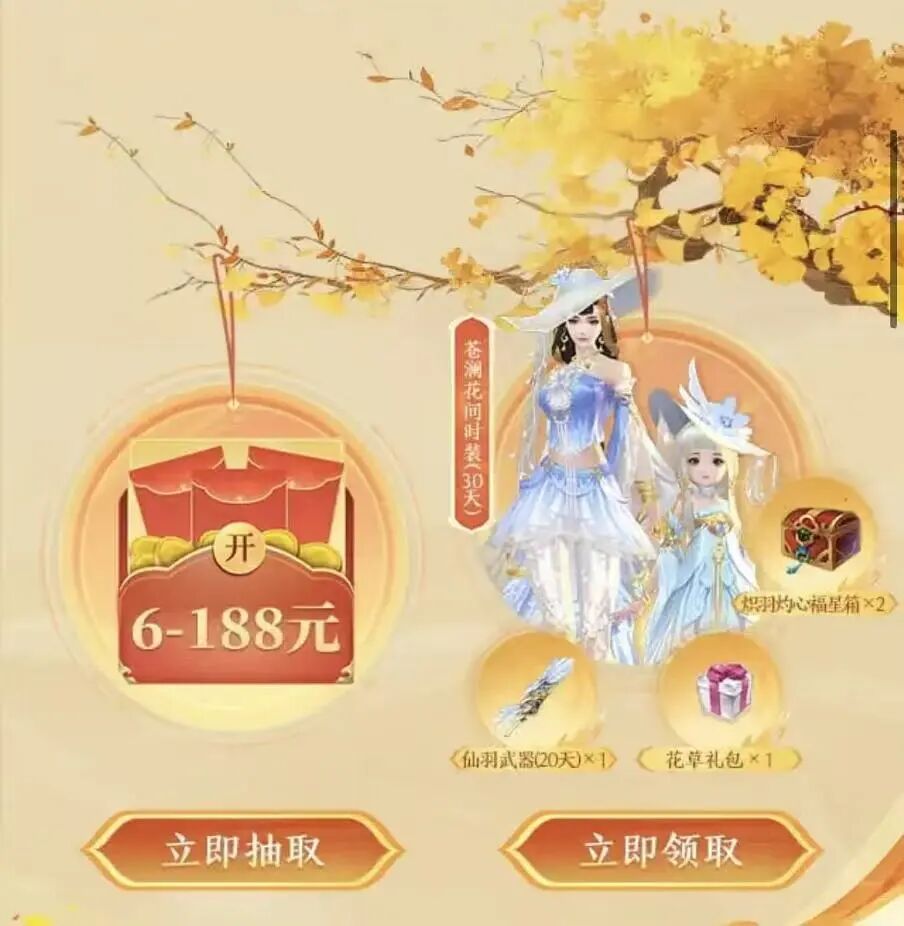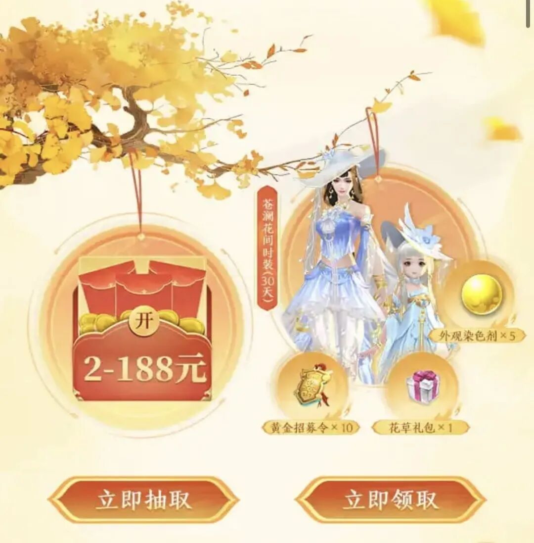 三、萌新注册暴击现金,绝版时装十连抽活动期间,前往新服注册的少侠可以领取限时时装【苍澜花间】,当等级达到20级,还可以领取现金奖励。