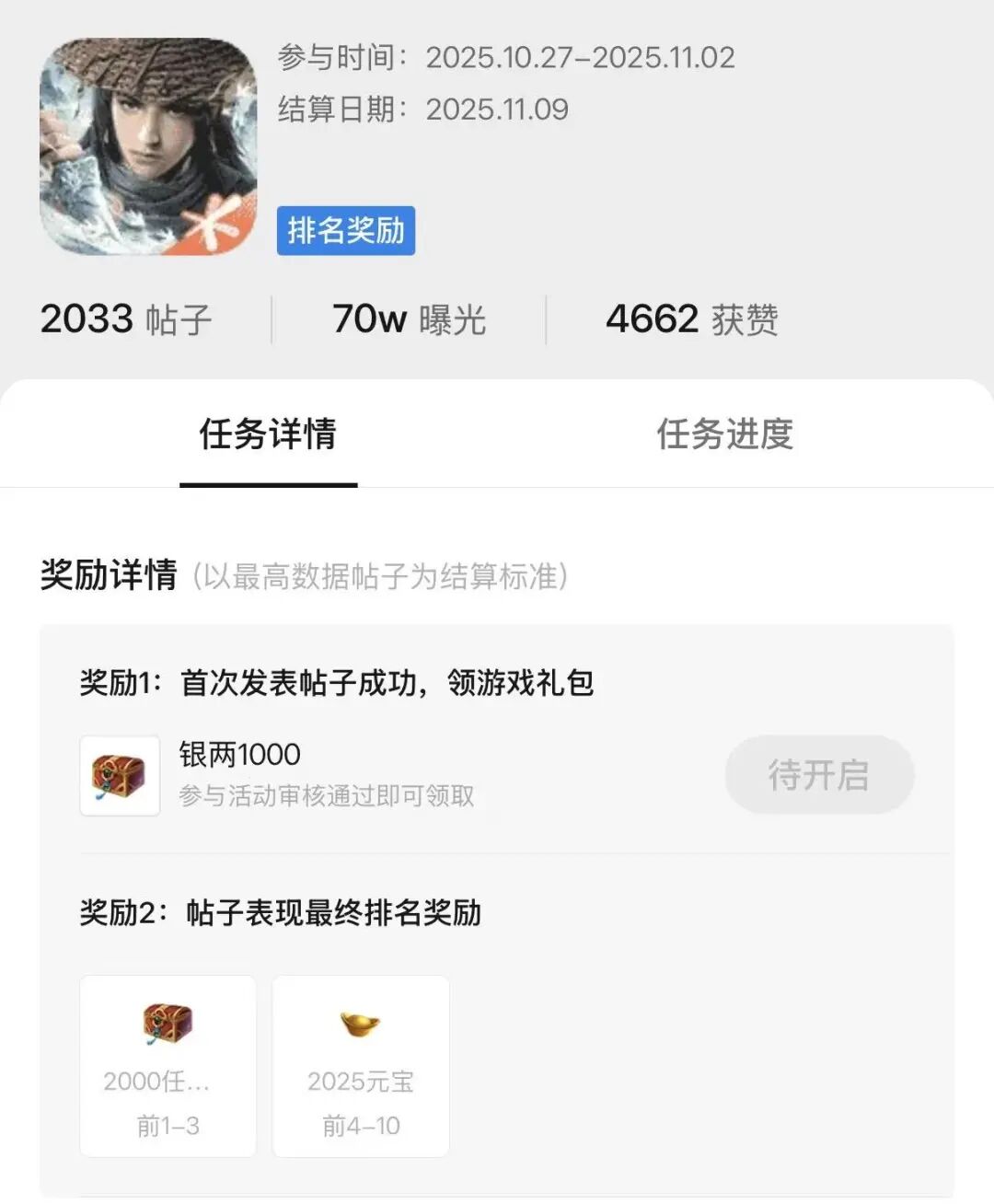 奖励一:发表帖领游戏礼包根据任务要求进行发帖,审核通过即可领取银两*1000;