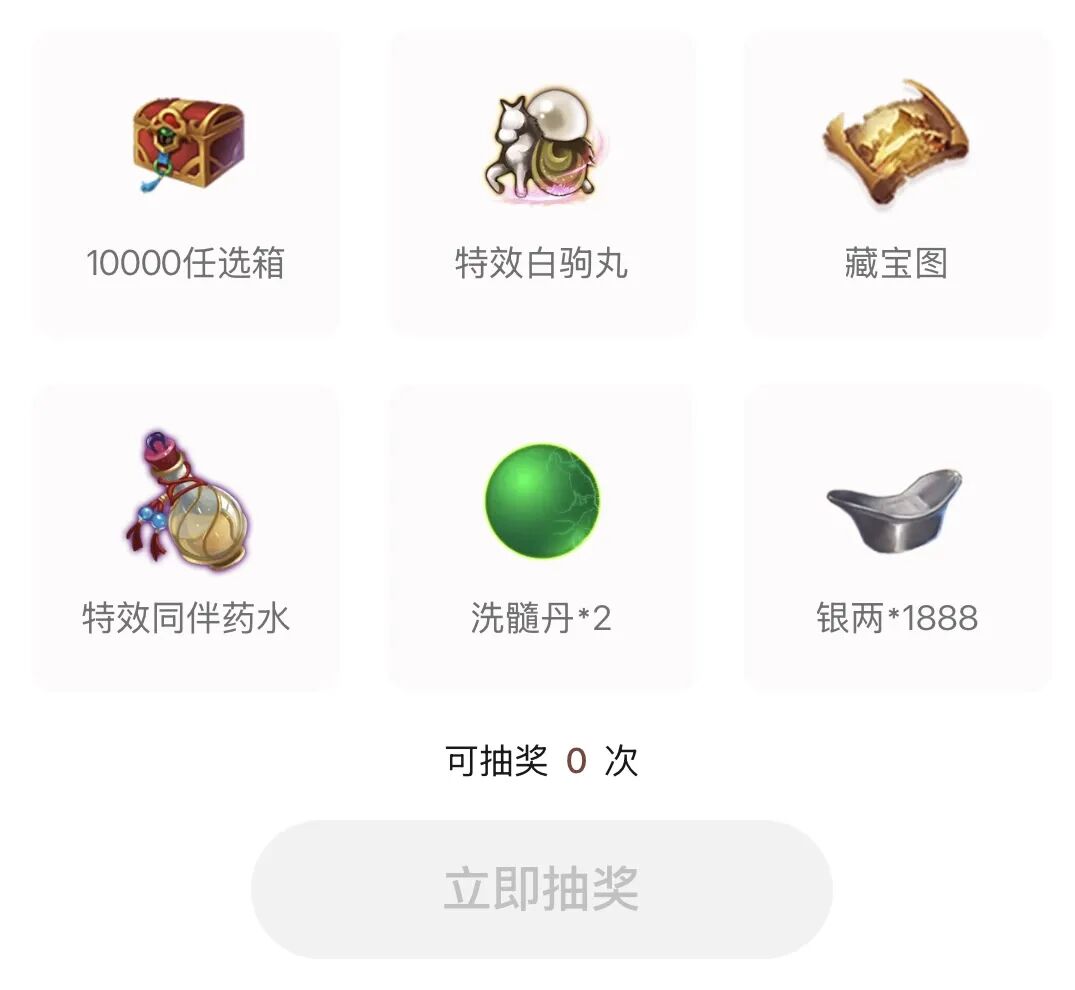除了以上活动外,少侠还可以点击下方传送门完成每日任务获取抽奖机会,有机会得10000真气元气贡献任选箱、特效白驹丸、藏宝图等丰厚游戏好礼!
