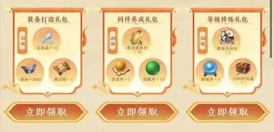四、萌新提升再送价值688元冲级礼包活动期间,首次下载游戏并前往新服完成注册的少侠,达到指定等级还可以领取对应新手福利大礼包!