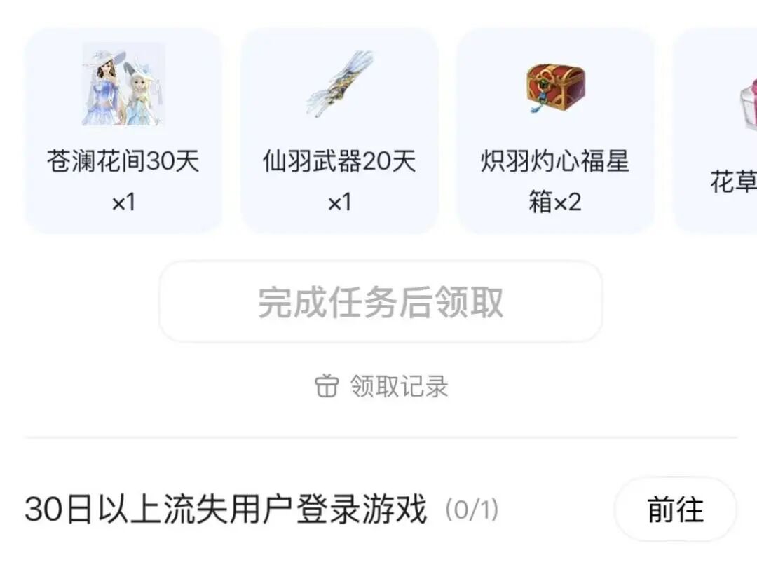 30天以上未登录的少侠,活动期间登录游戏即可领取6Q币及限时绝版时装【苍澜花间】、限时武器外观【仙羽武器】、炽羽灼心福星箱*2、花草礼包*1。