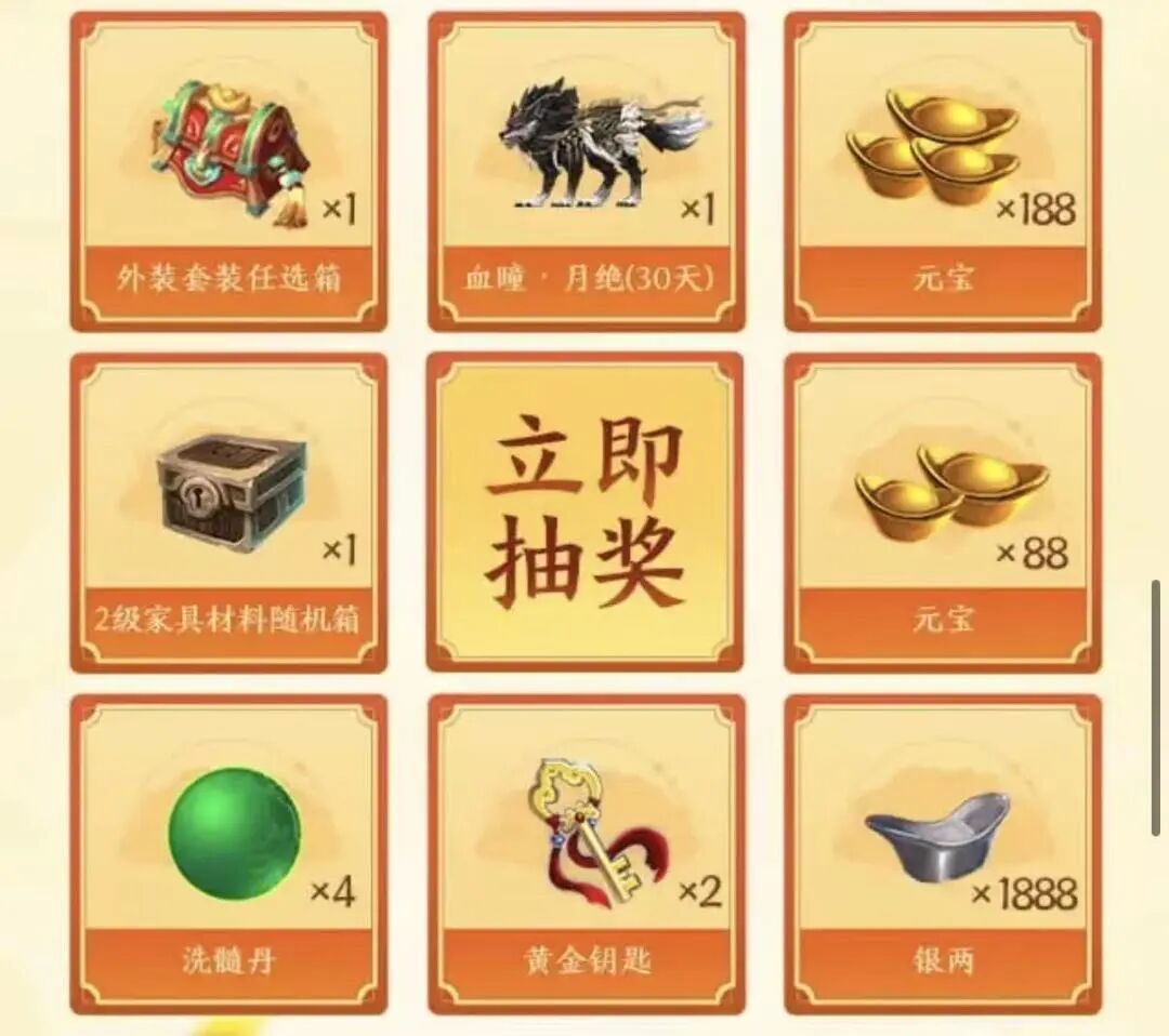 七、每日登录抽百万元宝 任选时装活动期间,全体少侠每天登录游戏后可进行活跃抽奖,参与即有机会获得血瞳·月绝坐骑、外装套装任选箱、元宝等其他奖励。