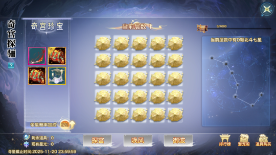 【奇宫探骊】活动内设多层珍宝,少侠可使用【寻星盘】进行寻星,每个格子开启后会提供5点星光值,星光值满4000后自动获得一次游龙惊墨豪华宝箱(绝版)或紫薇帝星,并清零星光值且不再累计;若在星光值未满时抽中大奖,则星光值清零且不再累计。