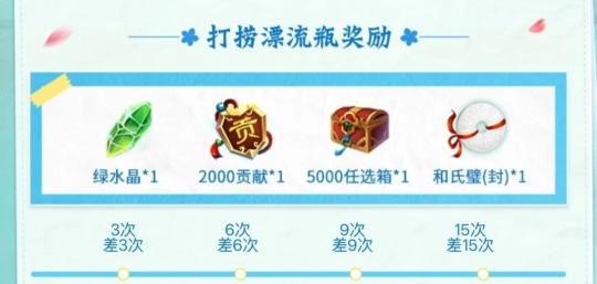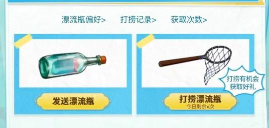 少侠可通过自定义文案或选择默认文案发送漂流瓶 (每日每人最多10次),打捞漂流瓶可获得他人发送的漂流瓶瓶, 每日打捞2次。