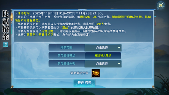 在11月11日10:00-11月23日21:30,50级以上的少侠可前往襄阳/临安找燕若雪开启“比武招亲”。