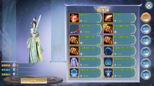 少侠可在【潜龙阁】消耗紫微帝星兑换指定的限定外装,也可以消耗星光可以兑换其他道具。阁内奖励多样,有桃花觉醒武器·绛羽、摇光珠崖主题家具等奖励!