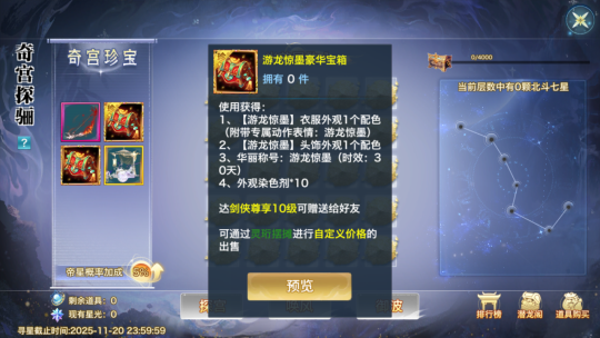 11月11日至11月20日23:59期间,【奇宫探骊】活动将限时开放,感兴趣的少侠可通过珍品限购获取【寻星盘】,有机会探得绝世秘宝!