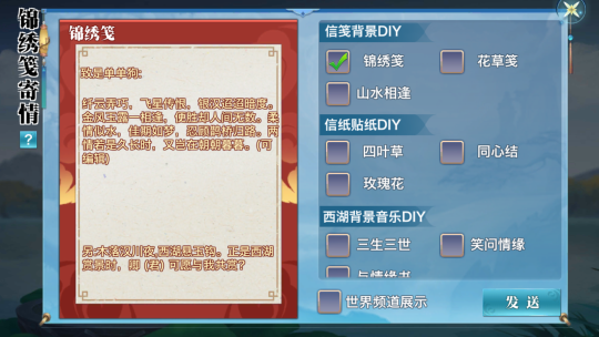 当少侠与寄出锦绣笺的好友进行组队,然后与月老对话选择“西湖赏景”,即可进入定制的西湖场景中进行双人互动和拍照留念。