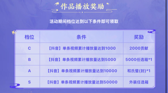 2.作品播放奖励:单条作品根据播放量领取对应档位奖励(C~S级),达到高级别可一并领取低级别奖励;仅限通过活动页面投稿的作品参与,各档位奖励有次数限制;