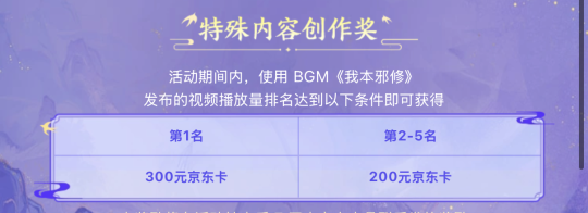 5.特殊内容创作奖:使用BGM《我本邪修》发布的视频根据累计播放量进行排名,活动结束后结算发放奖励;