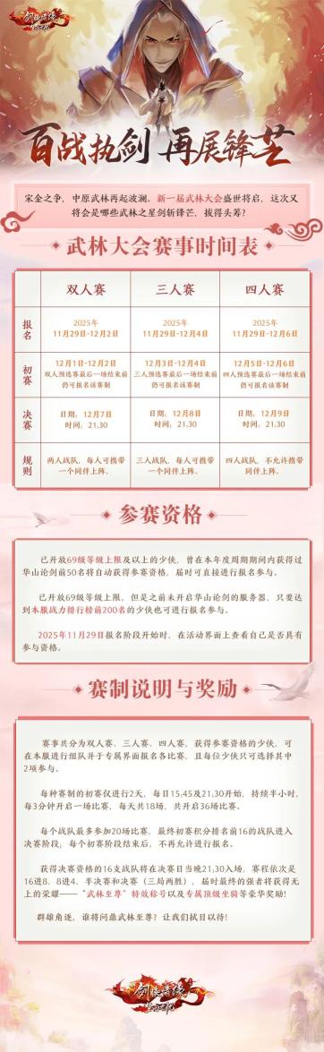 百战执剑,再展锋芒。剑侠江湖最高竞技赛事【武林大会】即将开启报名!11月29日起,武林大会进行期间将暂时不开放新等级上限。当武林大会活动结束后,符合开放新等级上限的区服将会自动开启。