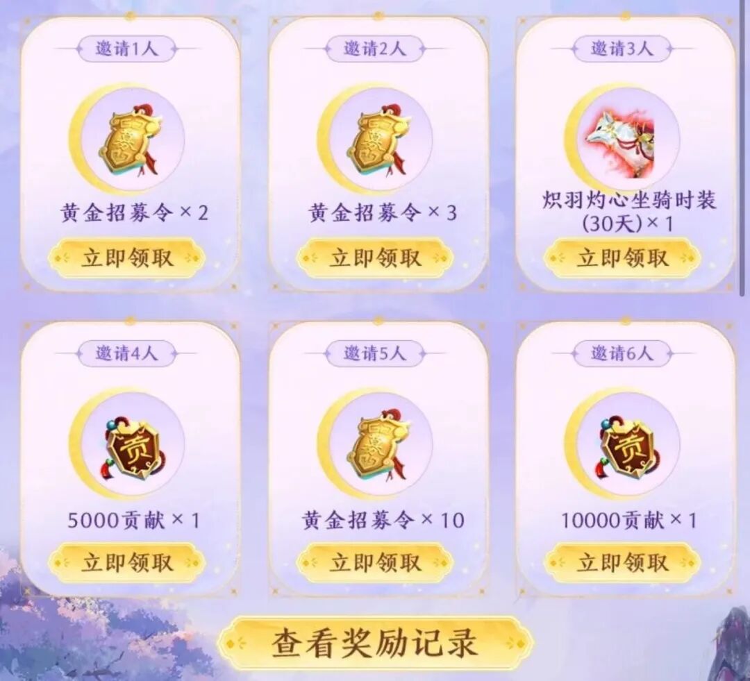累计邀请一定人数,可分别获得奖励,最高可一共领取15个黄金招募令、15000贡献及限量坐骑·炽羽灼心坐骑时装(30天)。
