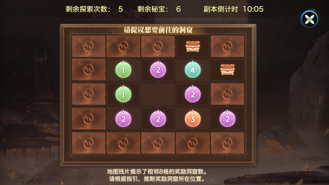 队长拥有8次探索机会,需选择临近的洞窟进行探索,队员可在小地图界面给到建议。
