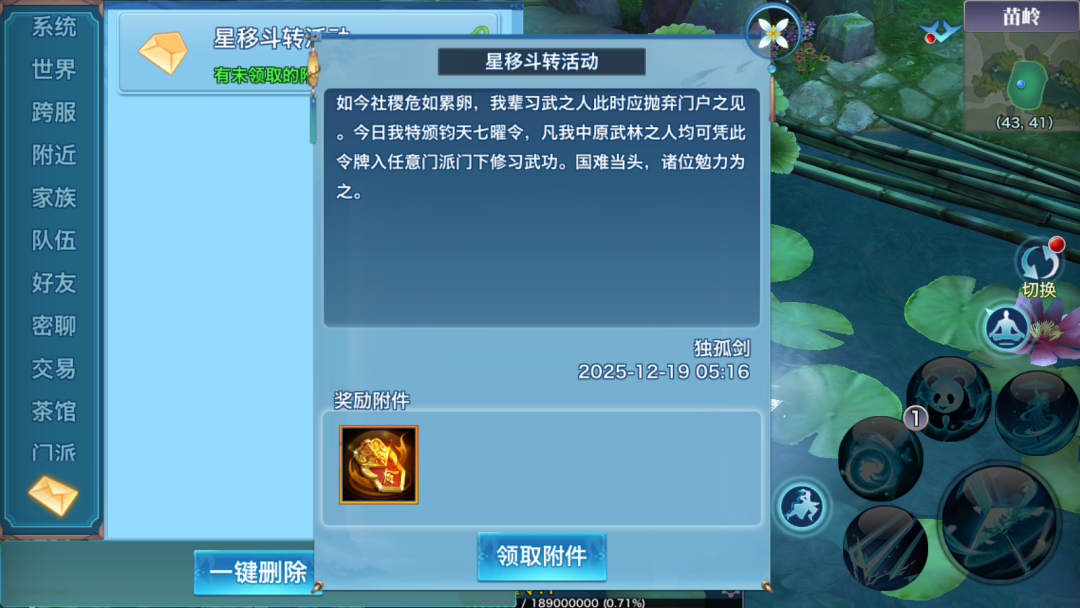 12月19日-12月21日期间,武林盟将同步开启【星移斗转】活动,届时达到40级的少侠可在邮箱领取【钧天七曜令】。