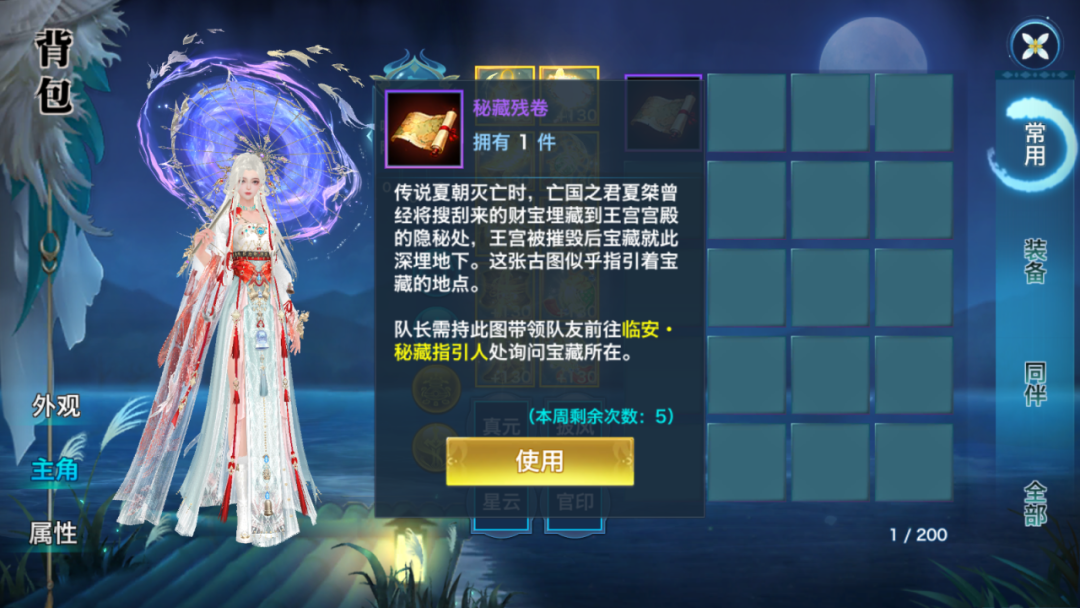 少侠在使用藏宝图挖宝时有机会获得【秘藏残卷】,邀请好友组成四人队伍即可前往临安【秘藏指引人】处开启活动,每周拥有5次开启次数。
