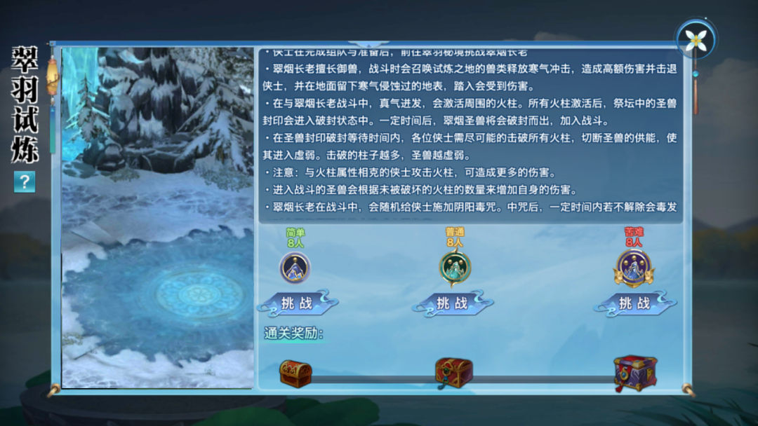 挑战当前难度或最高难度成功后,少侠可在活动界面领取对应难度的奖励。