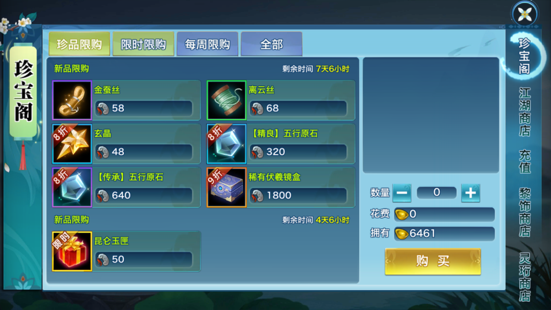 开放宗师等级上限的区服,可购买【玄晶】、【精良五行原石】和【传承五行原石】,开放凌霄等级上限的区服,还可购买【稀有伏羲镜盒】,需要的少侠不要错过~