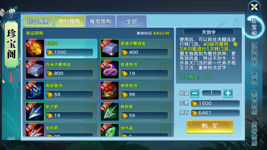 12月19日-12月25日期间,商城特惠元宝限购限时开启,全场最低2折起售,更有超低价天剑令等你!