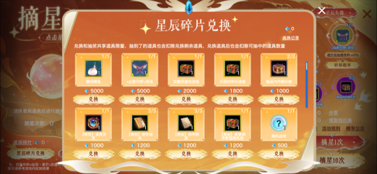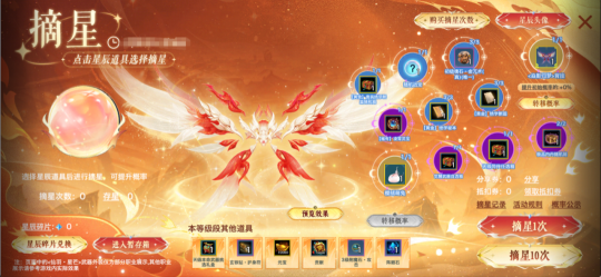 每颗星辰都有固定的道具奖励,每摘星一定次数可为星辰随机提升初始概率,摘星成功后可为橙色星辰提升初始概率。