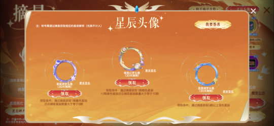 活动结束前成功摘取指定数量的星辰,还可以获得限时星辰头像框。满足条件的少侠可选择在本期星辰头像后进行签名,用来展示!