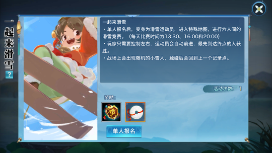 在活动期间内,活动每日开放时间为13:30、16:00以及20:00,每次开启3场,等级达到20级的少侠即可通过“活动”日历,单人参加比赛。