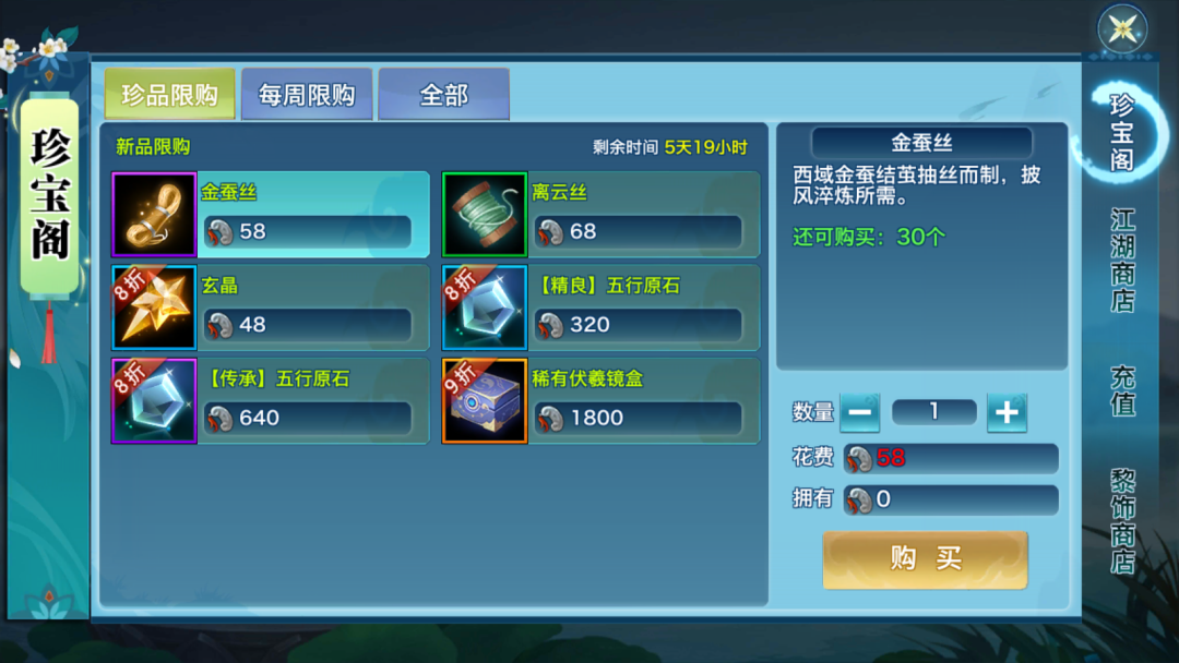 2月21日-2月28日期间,【材料限购】活动限时开启!开放119级等级上限的区服,可在商城【珍品限购】处购买珍稀材料金蚕丝与离云丝!