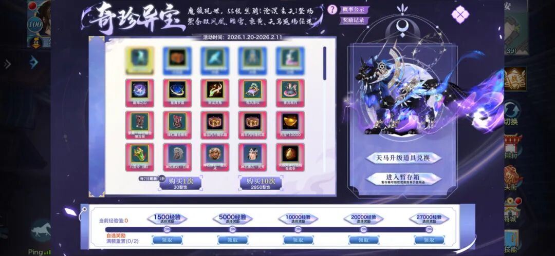 此次经验值自选奖励有神级坐骑·烬煌魔羽、神级坐骑·焰羽玉骢、神级坐骑·霆霓凤鸾、神级坐骑·琼霄乘黄、坐骑精魄·霆霓灵羽等奖励少侠可根据自身需求进行选择~