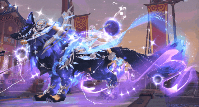 头顶鎏金时空轮盘牵引星辰之力,奔跑时拖曳星河倒悬的光尾;蓬松尾尖燃烧紫电与星芒交织的焰光,行走间如流星坠地,将时空涟漪碾在爪下。