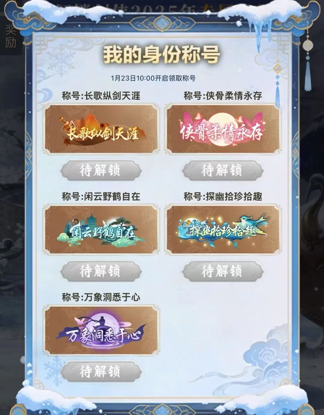 少侠们注意!称号将在1月23日10:00开放领取,届时小师妹也会提醒少侠们来领取的哦~