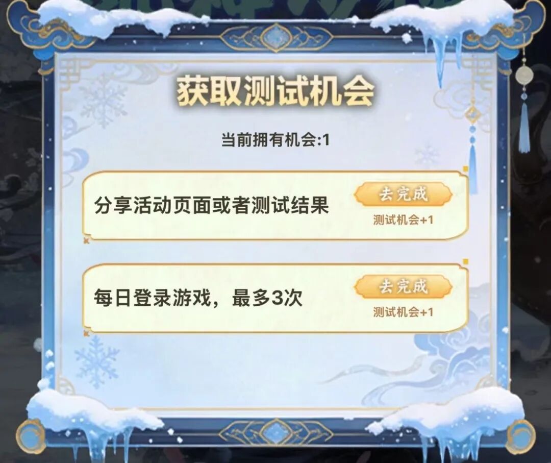 每位少侠初始拥有1次测试机会,通过完成指定任务,最多可累计获得4次机会。