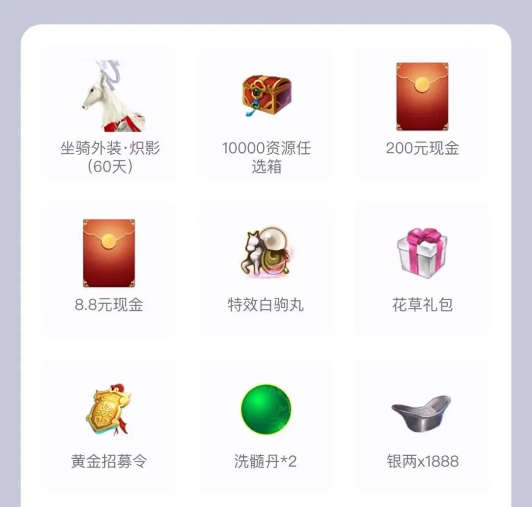 抽奖有机会获得200元现金、8.8元现金、10000真气元气贡献任选箱、坐骑外装·炽影(60天)等奖励。