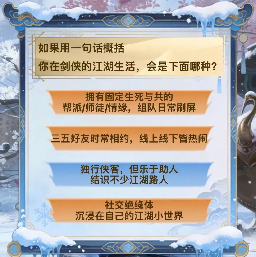 进入活动后,少侠需根据问题选择心中的答案,问题关乎你的江湖选择、处世之道与内心偏好。答案没有对错,只有最真实的你。