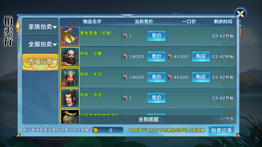 此为展示,实际以区服内为准稀有魂石等超多好礼均以最低价1黎饰起拍,超值拍卖不容错过!少侠们要抓紧机会,以超低价拍到心仪物品!