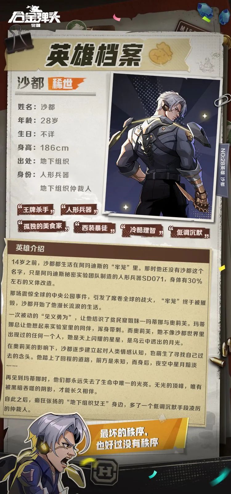 背景故事:曾是人形兵器SD071的沙都,生活于阿玛迪斯的“牢笼”。中央公园事件后,他逃离并流浪,偶遇玛蒂娜与奥莉芙。奥莉芙如光般照亮他的世界,让他学会情感与自我认知。然而,奥莉芙的离世让他深陷绝望,随后加入“地下组织”,成为玛蒂娜的伙伴,以仲裁人的身份维护秩序。