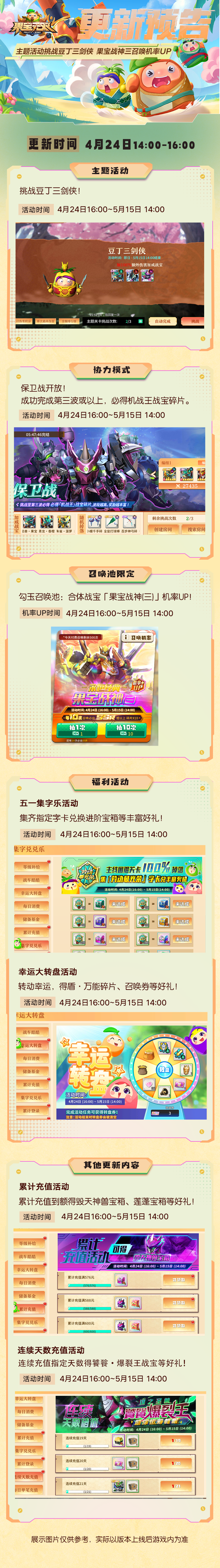 新一期主题活动开启,挑战豆丁三剑侠!合体战宝「果宝战神三」系列战宝召唤机率UP!还有五一集字乐、幸运大转盘活动等你参与领好礼!