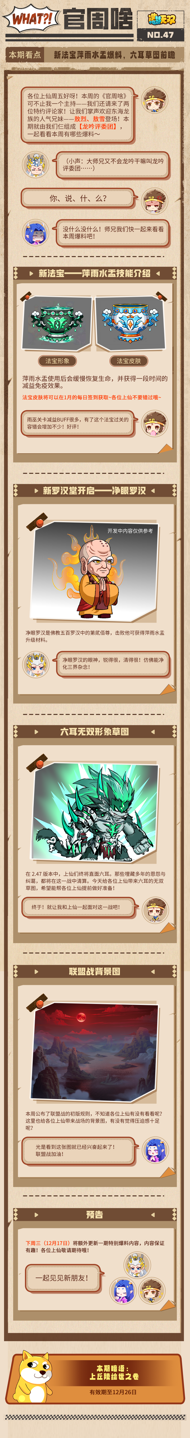 空空:上仙们下午好!本周的官周啥由空空我,以及敖烈和敖雪组成的【龙吟评委团】为大家献上!本期的重点内容有——新法宝萍雨水盂的介绍、六耳草图提前看,还有暗语福利等着上仙们领取哦!快来和空空一起看看吧!