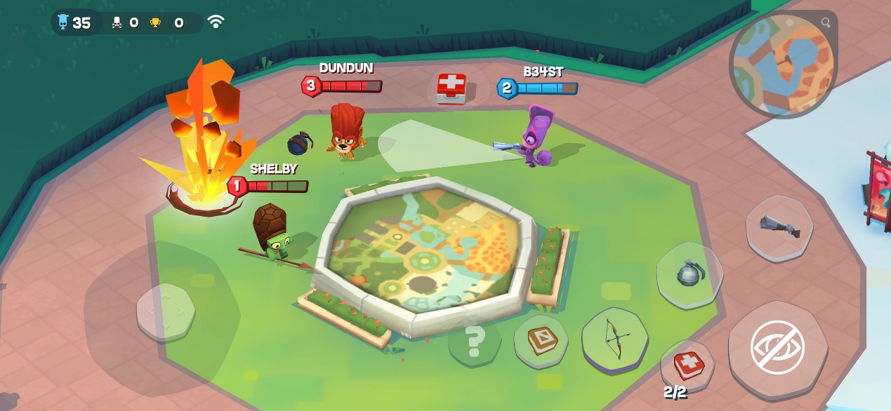 大部分动物都有炸弹,炸弹特点是中远程给对手造成;炸弹是范围性攻击,只要在轰炸圈内被伤害的数值都较高。在实际战斗中炸弹是运用最多的武器,但也需要对敌人走位有一定预判,比如在障碍物稀少的路面和在草丛中的打法就不一样;而炸弹也需要跟其他技能配合,比如投掷炸弹后把敌人压在狭小空间,再放近战属性标枪/霰弹枪会提高胜率。